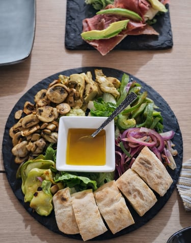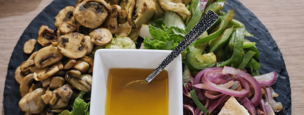 Calabacín, berenjena, zanahoria, champiñones, pimientos y más, con aceite de ajo y grisines.